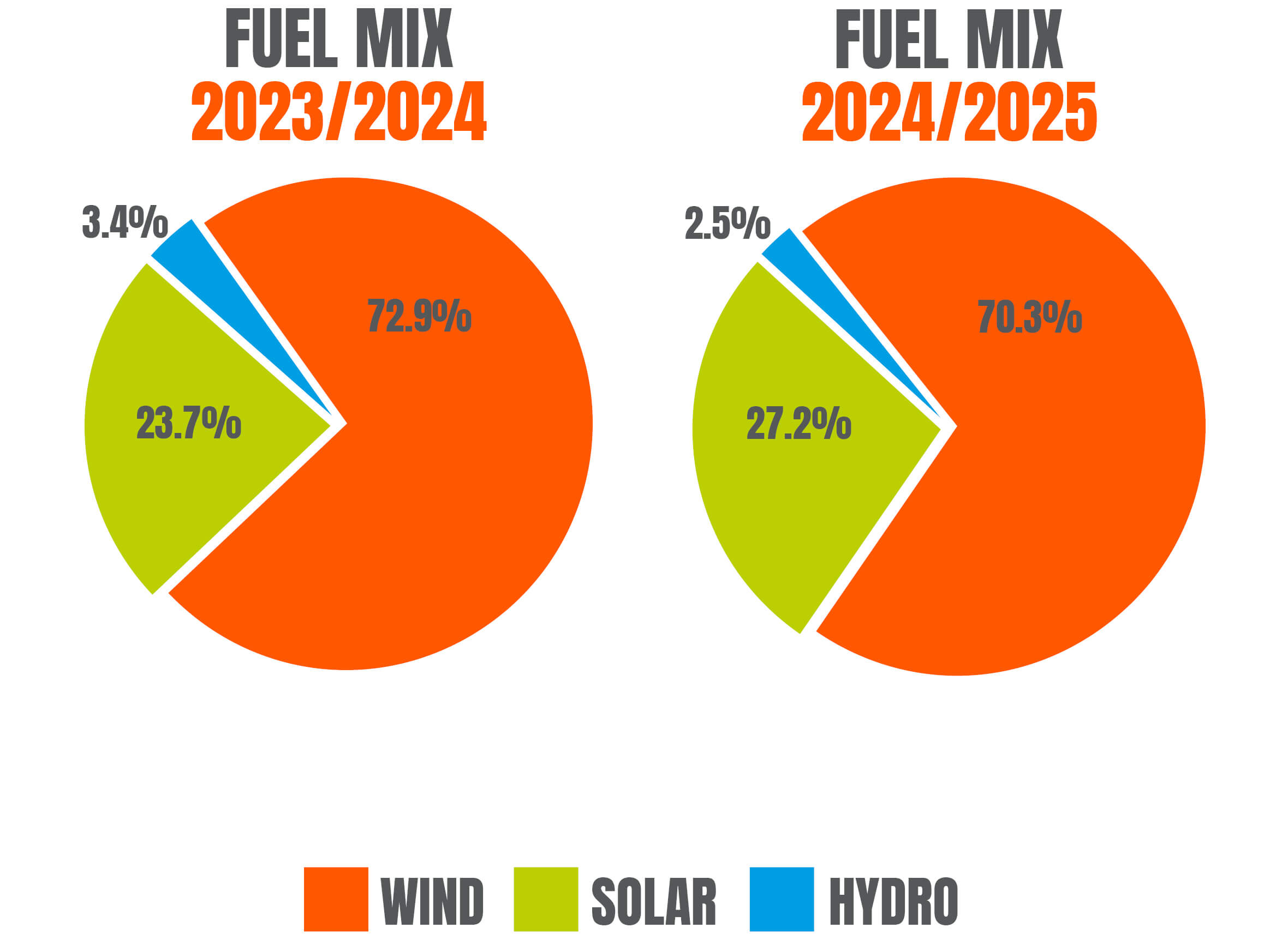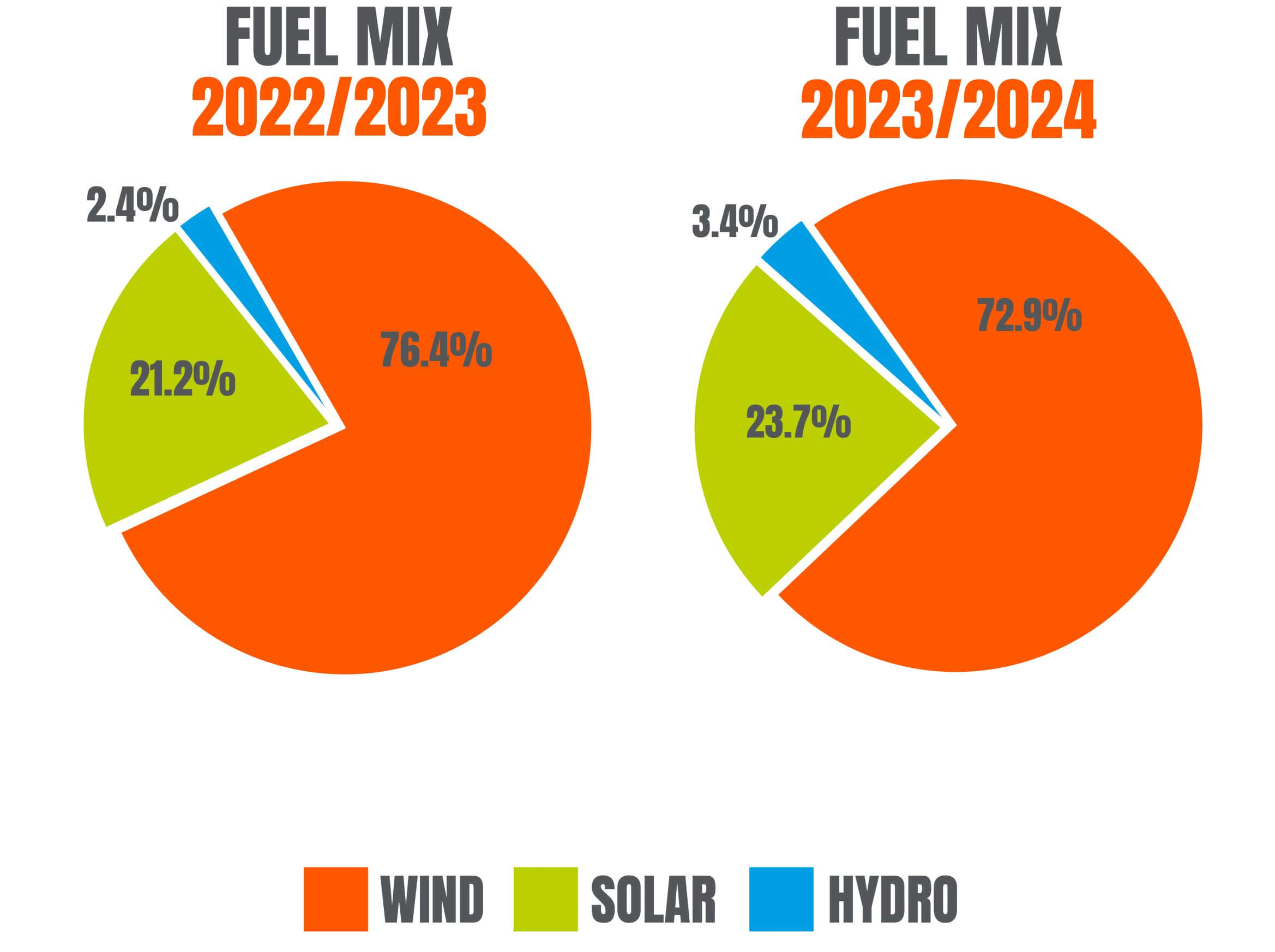 We’re proud to announce that our 2024/25 fuel mix is zero carbon and 100% renewable*, compared to the UK average of 42.10% renewable.